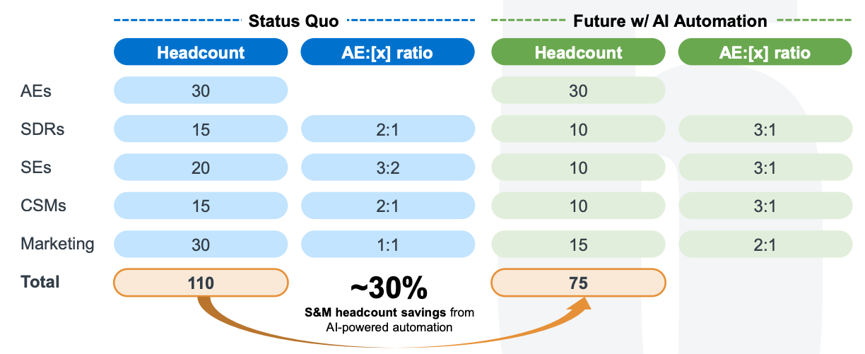 The integration of AI into sales and marketing operations heralds a significant shift from traditional team structures to a more streamlined, efficient model. The data showcases a remarkable 30% reduction in workforce requirements while simultaneously enhancing the productivity ratios across S&M roles.
